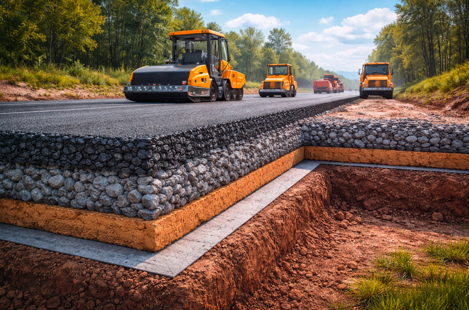 Щебеночные основания дают жёсткость и распределение нагрузки. Песок работает как выравнивающий и дренирующий слой. Геосинтетика предотвращает смешивание слоёв и перераспределяет напряжения.